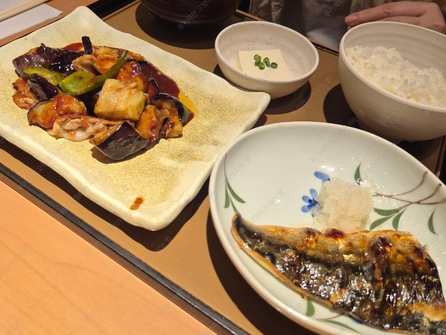엄마가 주문한 가지볶음 정식은 고등어구이도 같이 나왔는데, 무에 간장을 부어 먹으면 된다.