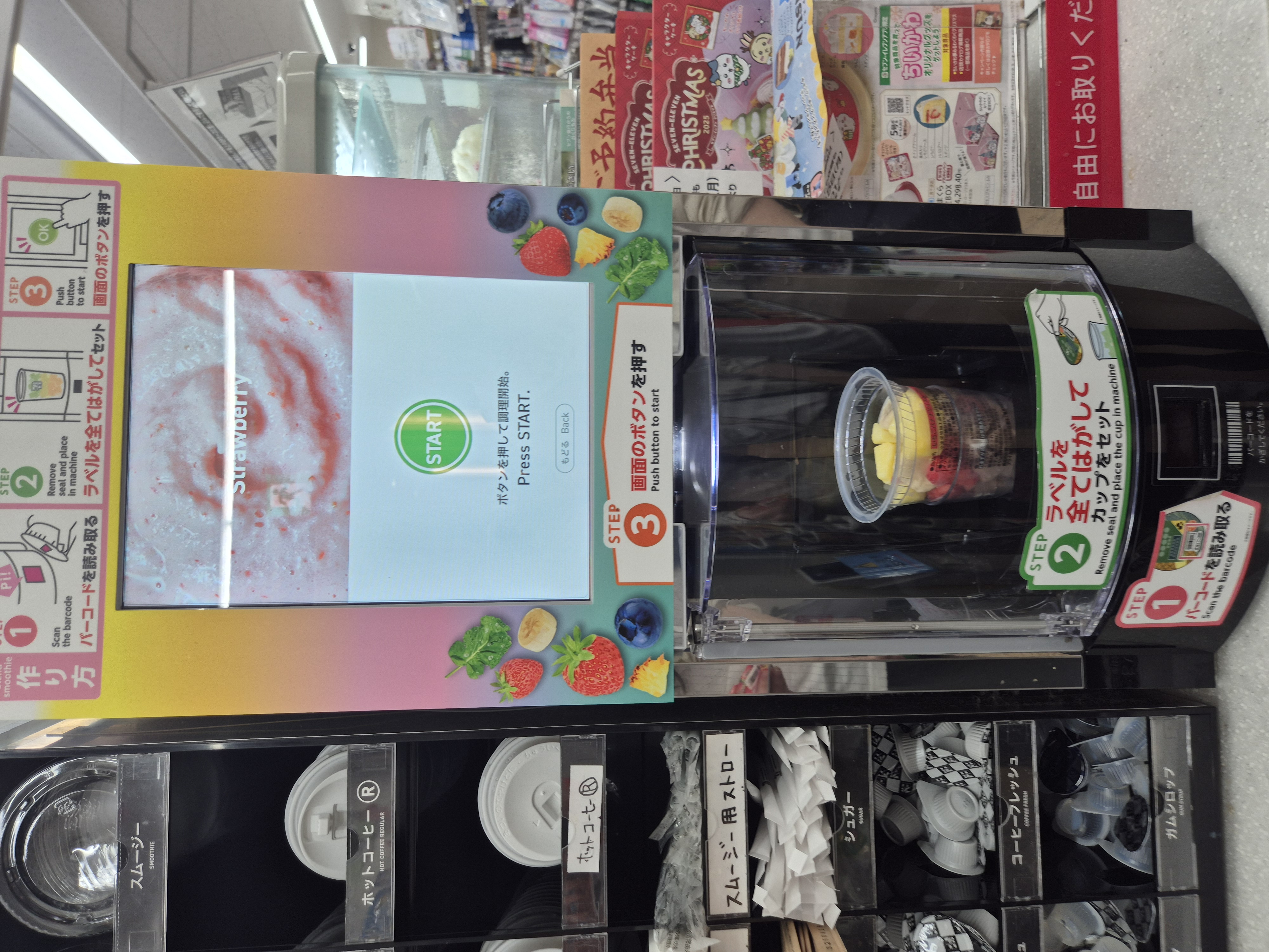 문이 열리면 뚜껑 벗기고, 기계 중앙에 스무디를 맞게 꽂아 넣으면 된다.
